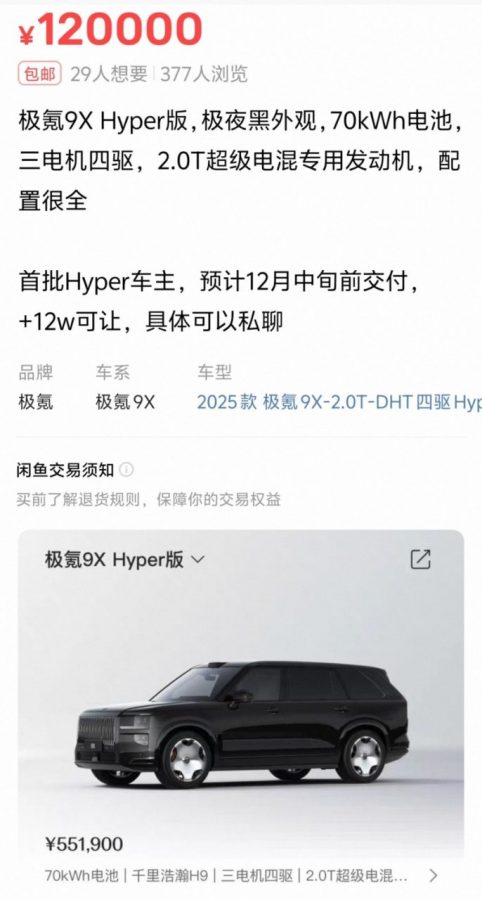 В последнее время на китайской платформе по торговле подержанными товарами Xianyu наблюдается необычайно высокий спрос на предзаказанные экземпляры электромобиля Zeekr 9X. Покупатели готовы платить надбавки до 120 000 юаней (примерно 17 000 долларов США) за возможность получить этот полноразмерный гибридный SUV раньше официального срока. News China провел собственное расследование, подтвердившее эту тенденцию. Официальная стартовая цена Zeekr 9X составляет 465 900 юаней (около 66 000 долларов США), что делает наценку на вторичном рынке внушительной, в пределах 10-26% от розничной стоимости.